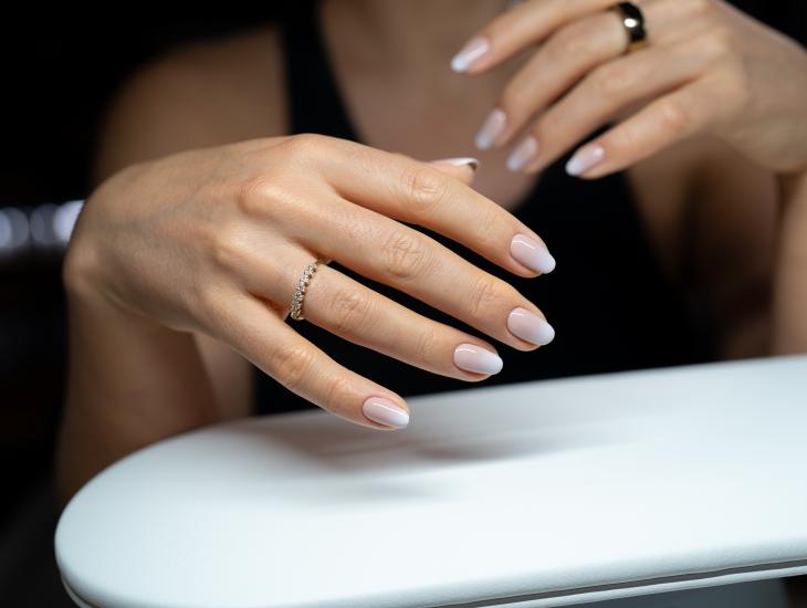 1) Příprava nehtů a úprava kůžiček: Nehty jsou pečlivě očištěny a upraveny do požadovaného tvaru. Kutikuly jsou jemně zatlačeny a nehtová plocha je připravena na aplikaci. Kůžičky jsou opracovány a zahlazeny.2) Aplikace základní barvy: Na nehty se nanáší základní vrstva v jemném růžovém nebo nude odstínu, která slouží jako podklad pro gradientní efekt.